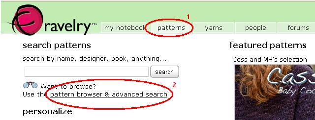 2. Quando a guia “patterns” for exibida, clique no link “pattern browser & advanced search” (navegador de receitas & busca avançada)