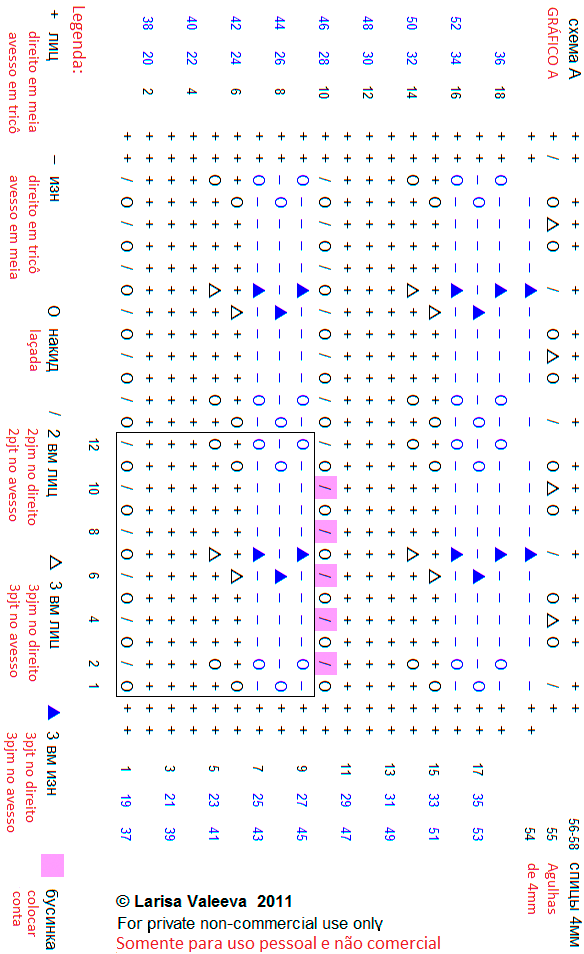 Nas carreiras 11, 29 e 47 coloque as contas no ponto da carreira anterior, ou seja, das carreiras 10, 28 e 46. Na carreira 10 e 46 coloque as contas nos pontos entre as laçadas de cada repetição ímpar (flor). Na carreira 29 coloque as contas nos pontos de cada repetição par. Na carreira 56 mude para agulhas 4mm, quantidade de pontos: 236.